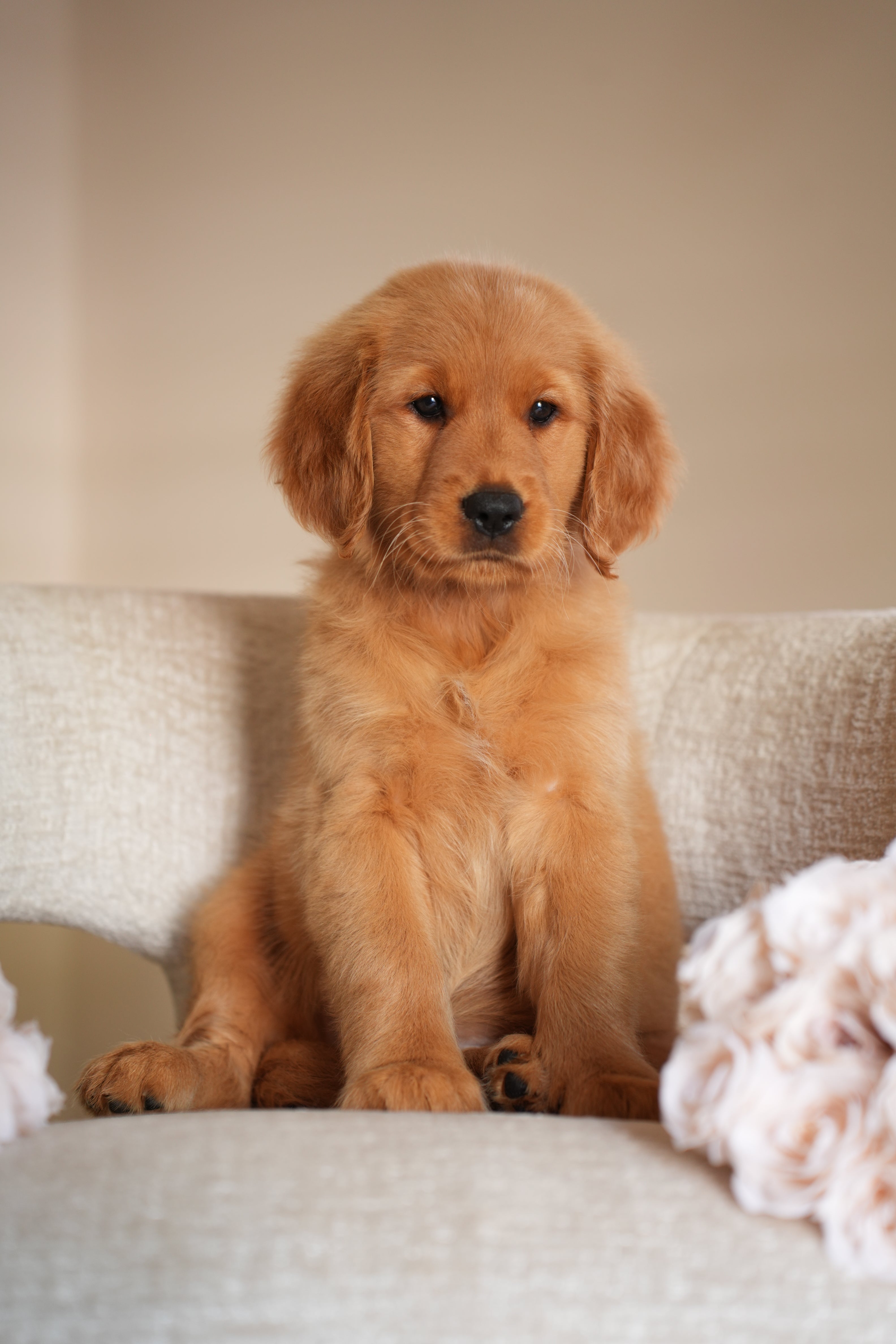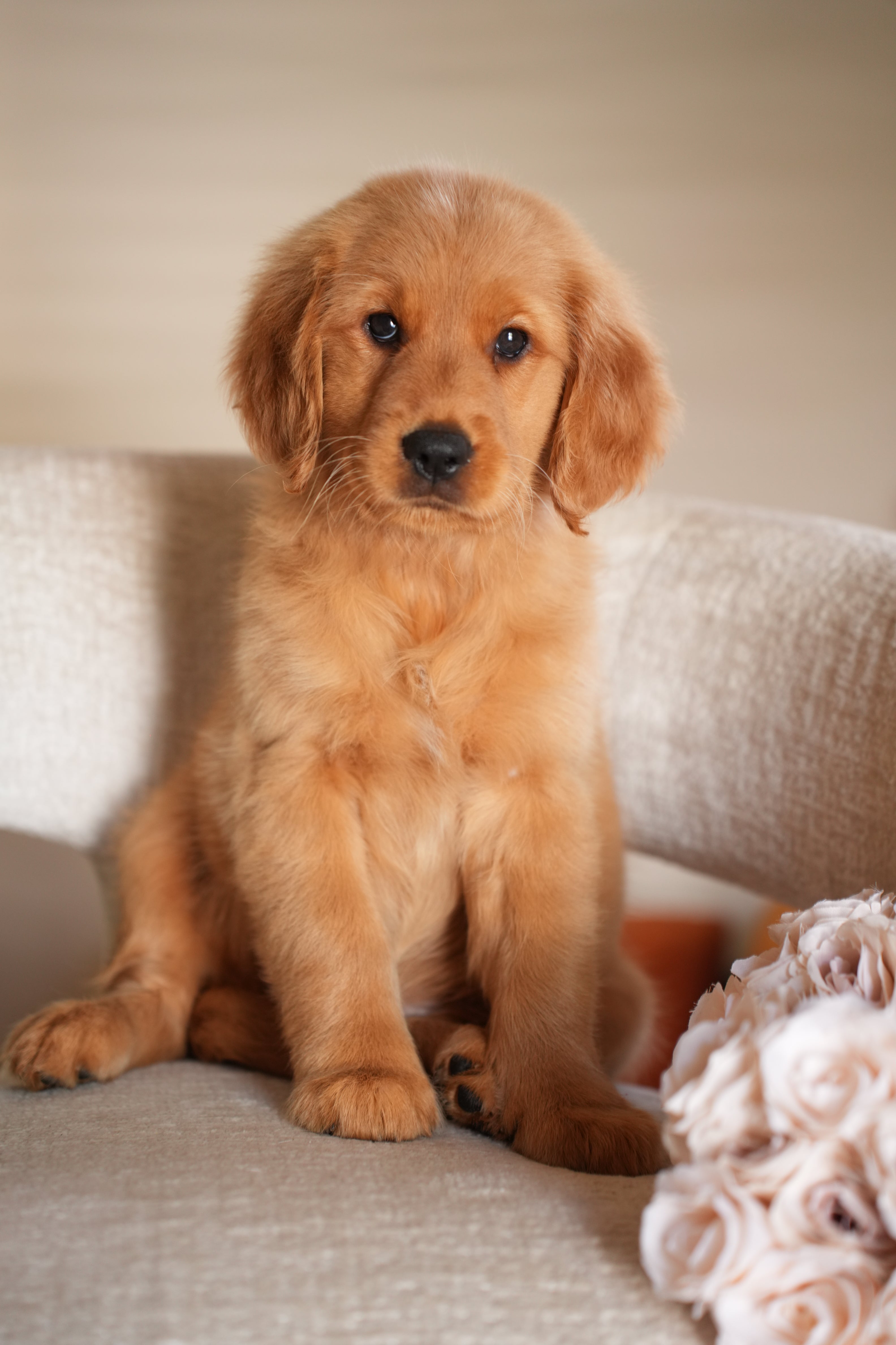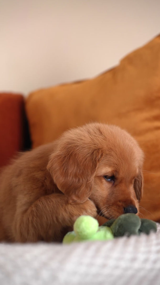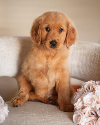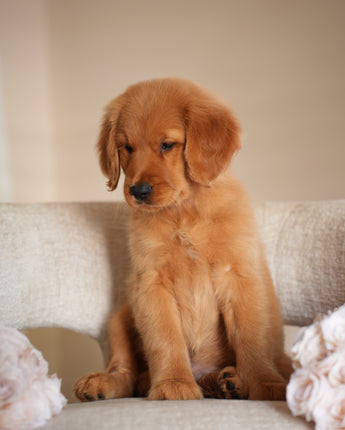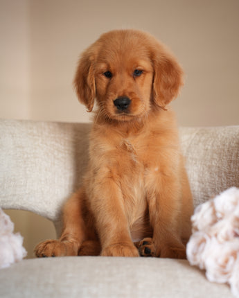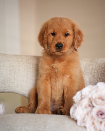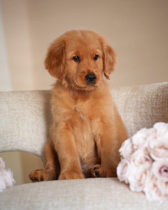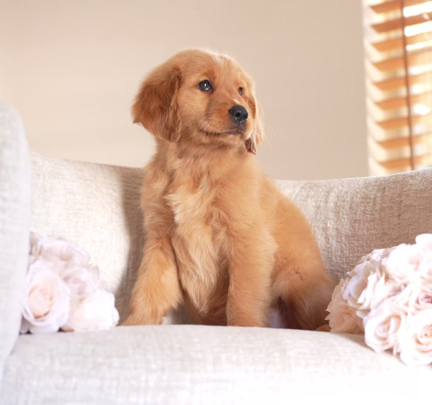 Ruby has the kind of temperament that makes her perfect for therapy or service work. She’s extremely calm and quiet — the type of puppy you can truly take anywhere. Her golden-red coat is so striking it hardly looks real, and it’s even more beautiful in person. Ruby’s happiest moments are when she’s curled up on your lap while you watch TV, just being close.