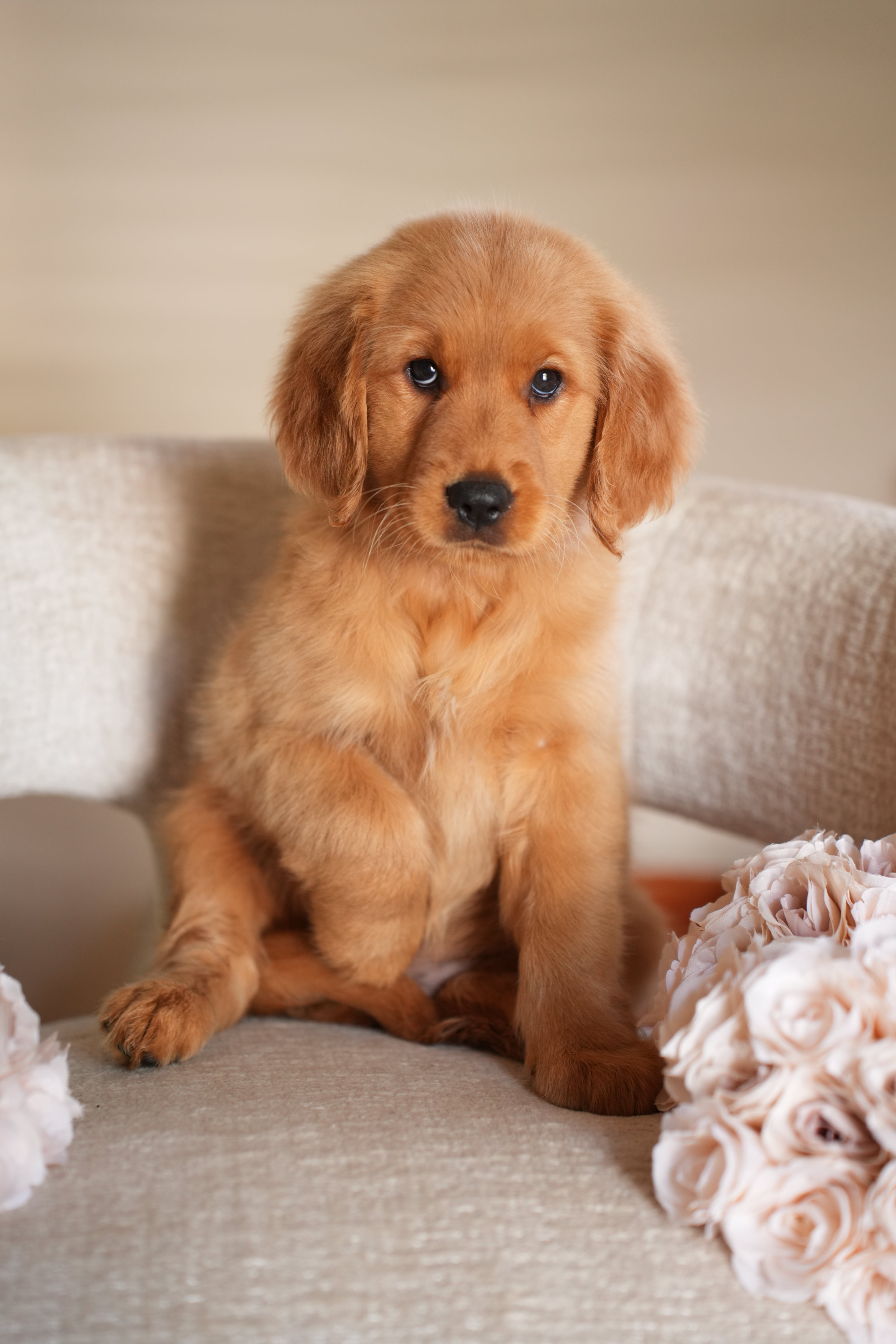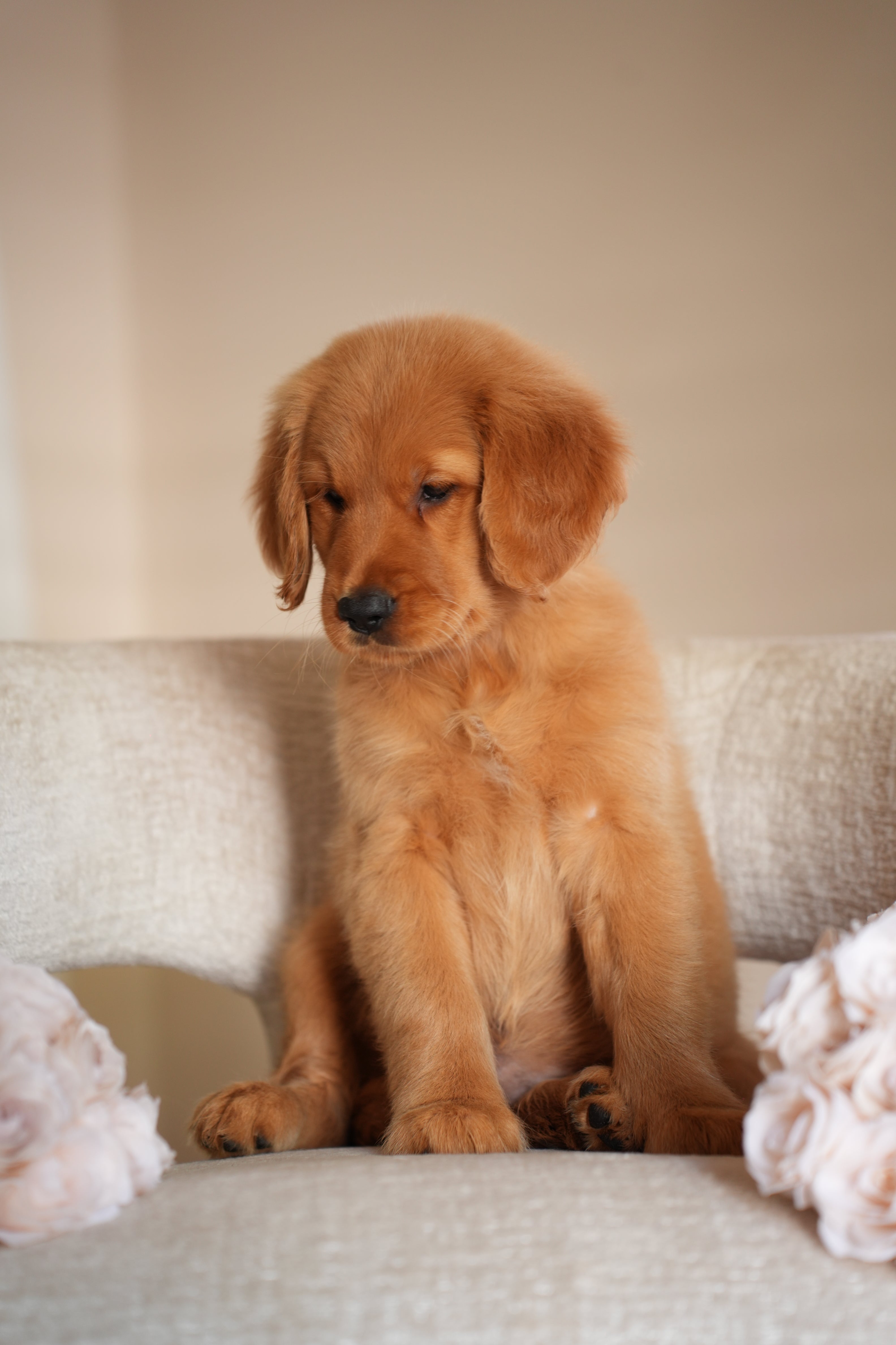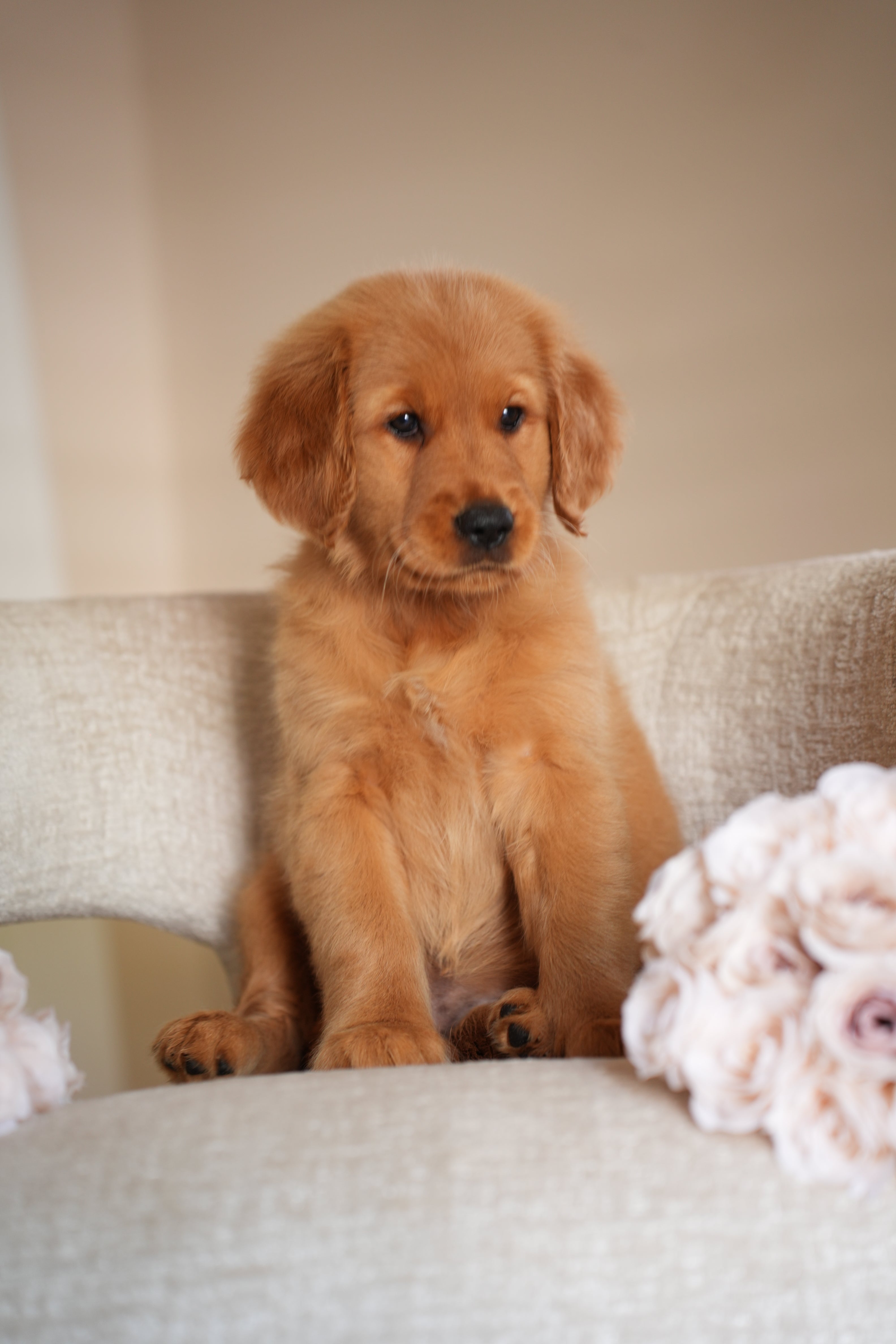 Ruby has the kind of temperament that makes her perfect for therapy or service work. She’s extremely calm and quiet — the type of puppy you can truly take anywhere. Her golden-red coat is so striking it hardly looks real, and it’s even more beautiful in person. Ruby’s happiest moments are when she’s curled up on your lap while you watch TV, just being close.